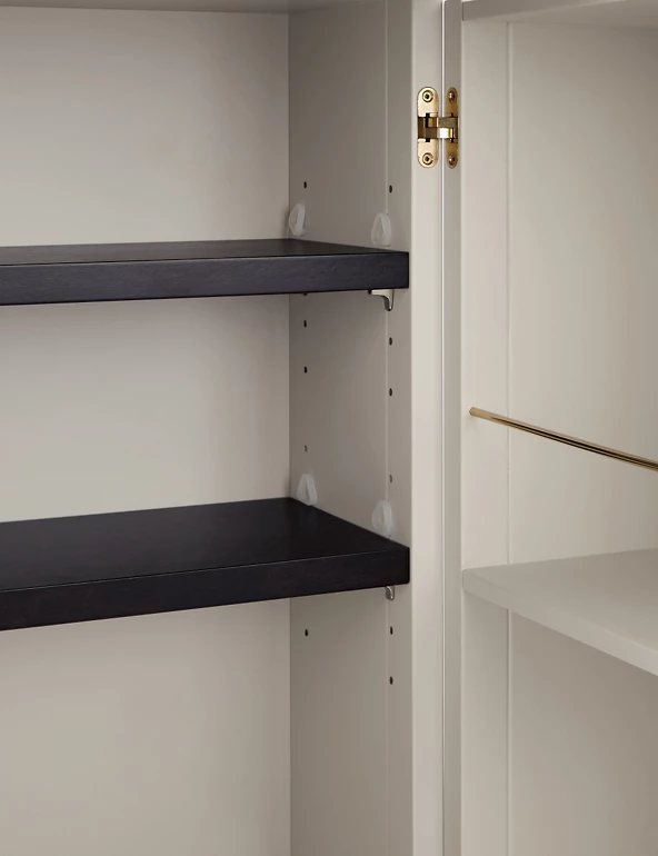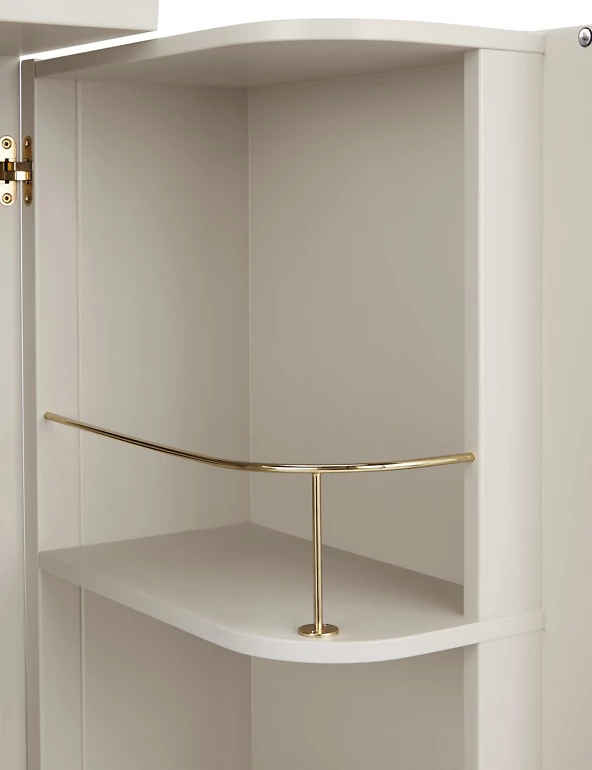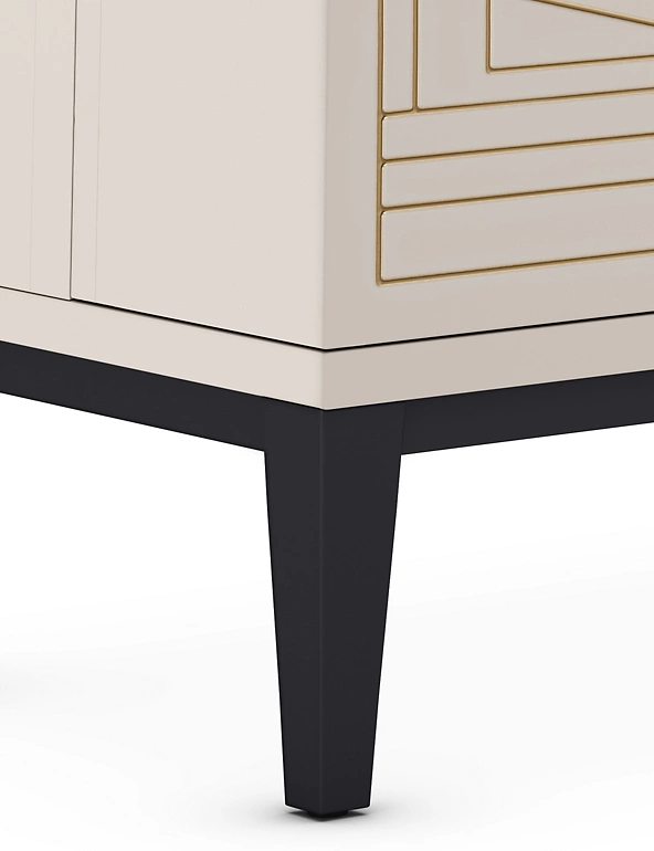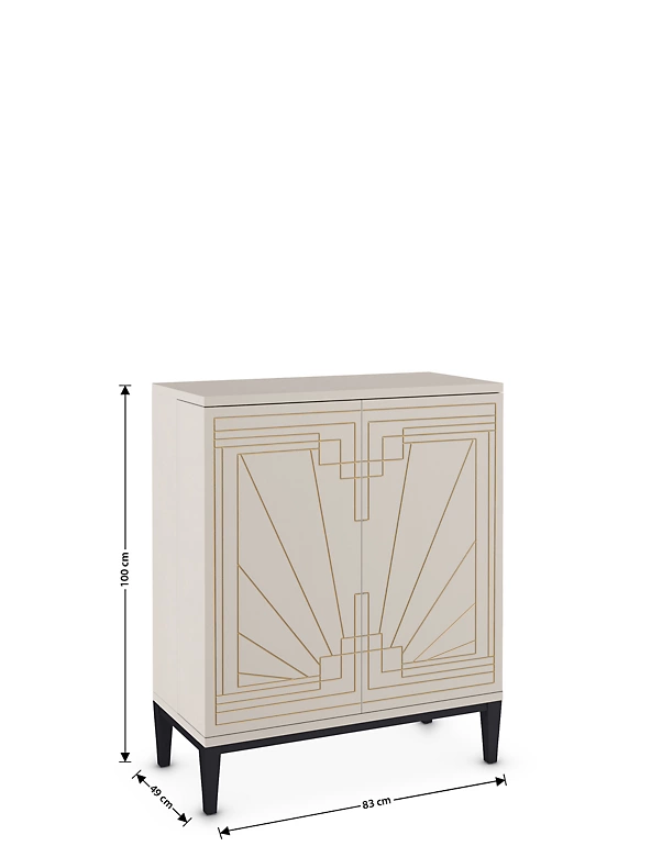 Nothing quite exudes charm and refinery as much as an elegant home cocktail bar, so channel your inner Gatsby with our stunning Carraway drinks cabinet. It benefits from a double cupboard with internal shelving and bow fronted sides each with a shelf for storing and displaying bottles, glassware and general bar accompaniments. A nod to retro jazz age styling, it has been lacquered in a mink, light grey colour, with dark stained timber legs and finished with an Art Deco pattern etched onto the doors.