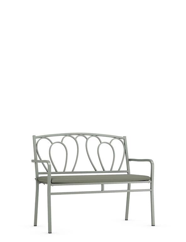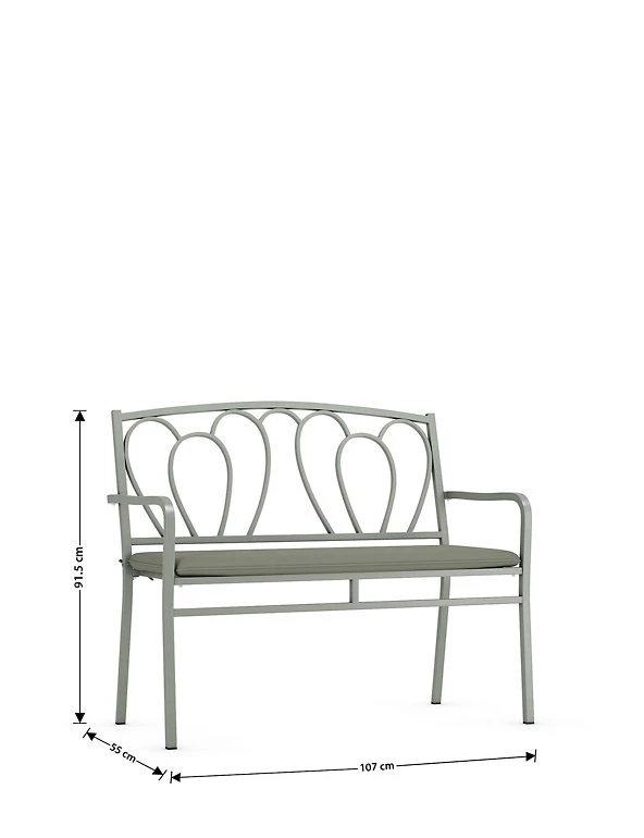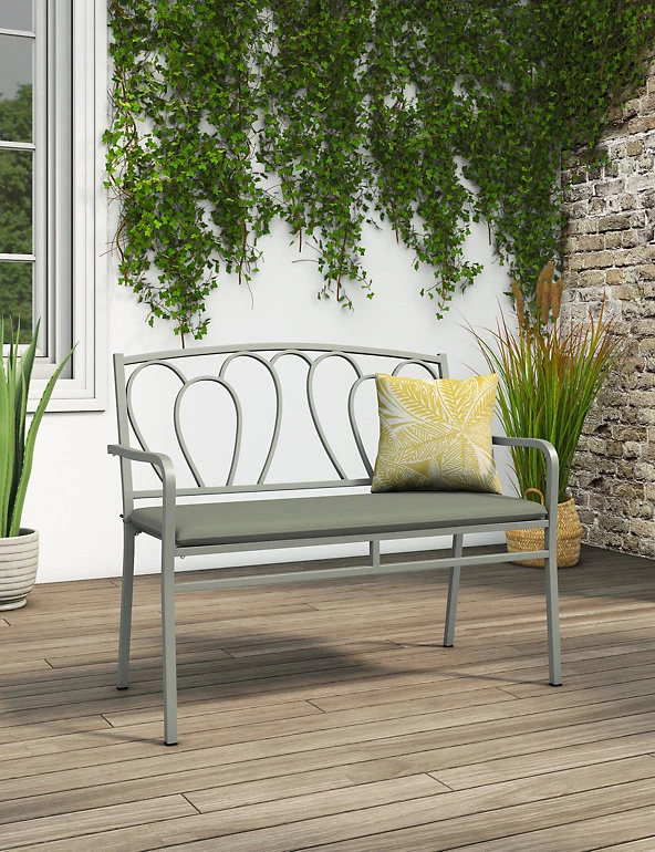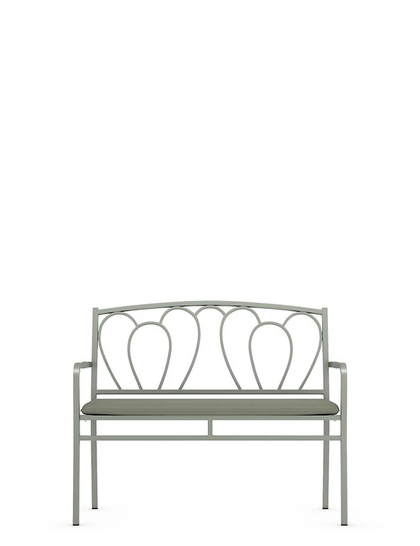 Add some elegant seating to your outdoor space with this two-seater bench from our Stroud range. The metalwork on the back is formed into heart-like curves for a lovable touch, and a powder-coated finish to the frame ensures durability.