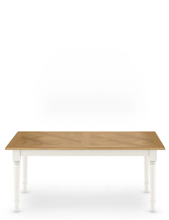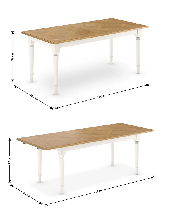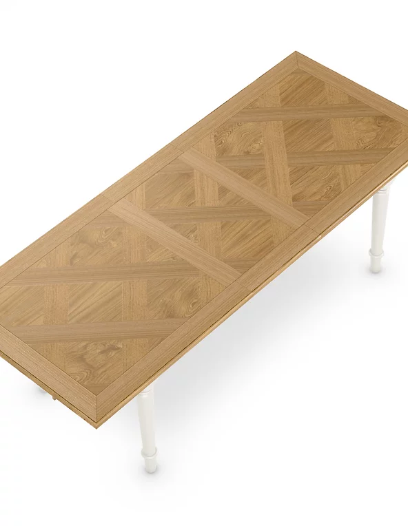 Give your entertaining space a welcoming, elegant feel with this classic dining table from our Greenwich collection. The generously sized real oak veneer top can be extended when you have extra guests, and is detailed with an intricate marquetry design. Its frame and turned legs are hand-painted in a low sheen lacquer for a timeless look and durable, long-lasting finish.