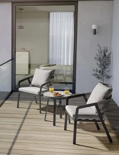 - Finish: synthetic wicker weaving, metal, water repellent cushion & glass