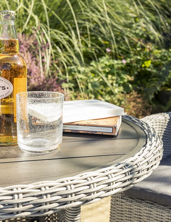 Make use of your outdoor space with this modern bistro table and chairs set from the Palma range. This versatile set includes a table and two cushioned chairs with sturdy aluminium frames and UV-resistant hand-woven wicker. The table is finished with a hand-painted aluminium slat top. This stylish garden furniture is ideal for balconies or smaller outdoor spaces.