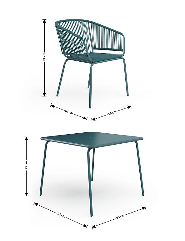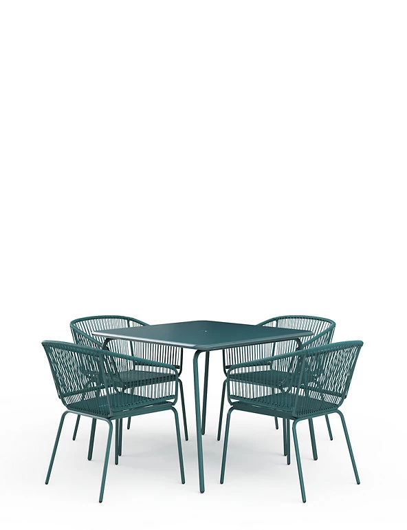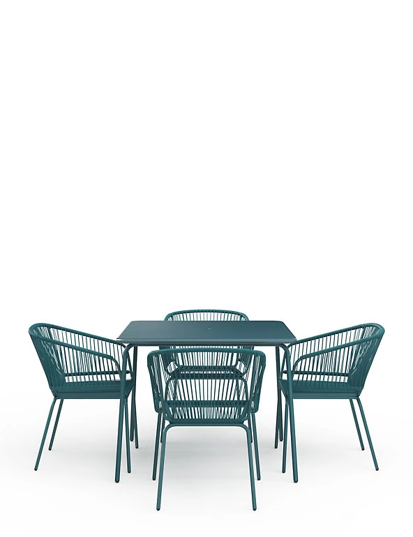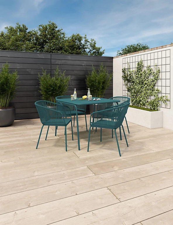 Host a dinner for family and friends in your garden with this stylish Lois dining set. This contemporary set comes with a metal table and four curved woven chairs, all powder-coated for long-lasting wear.