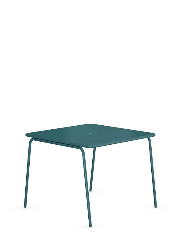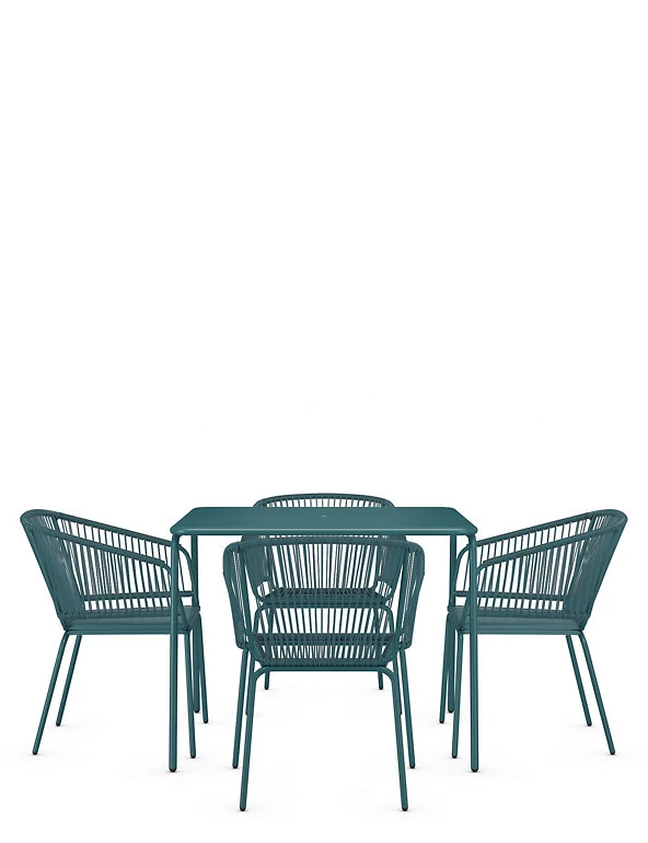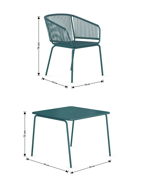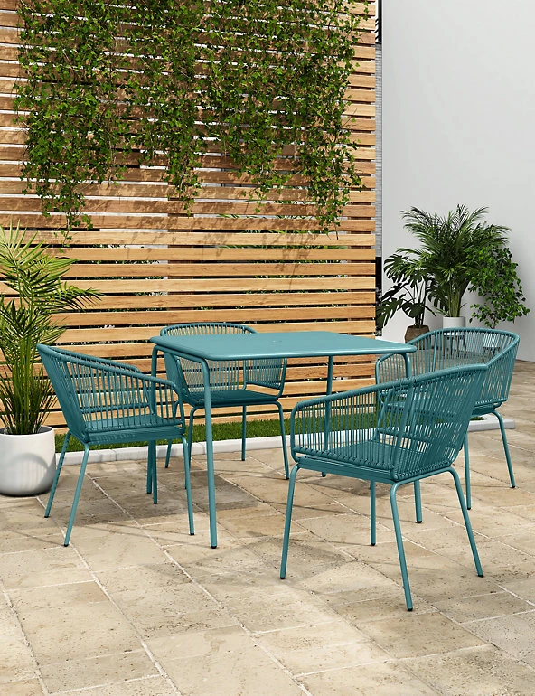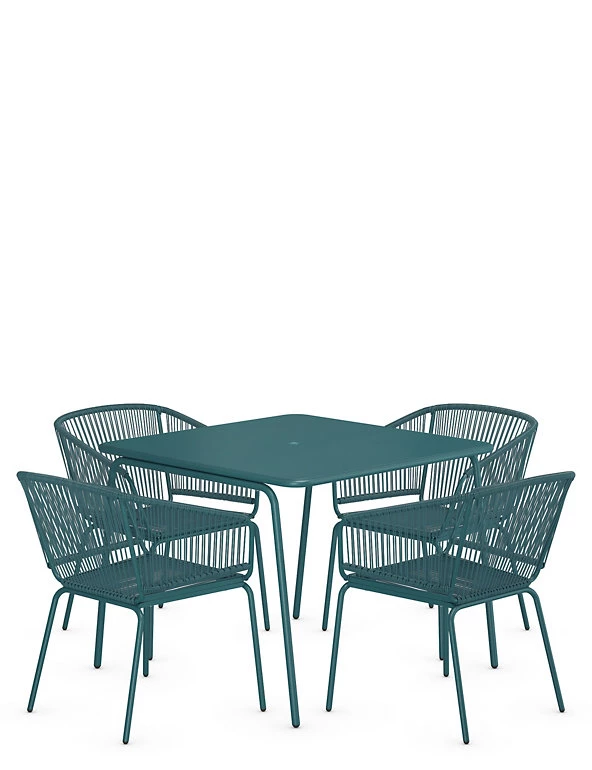Enjoy statement outdoor seating (and eating) with our modern Lois dining set. It comprises a stylish square table and four matching chairs with a comfortable curved design. Powder coating adds a protective finish to the metal.