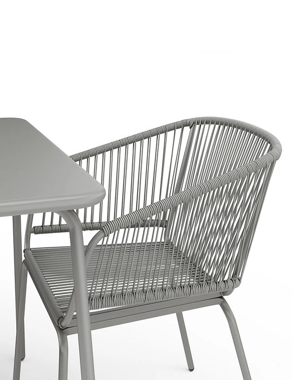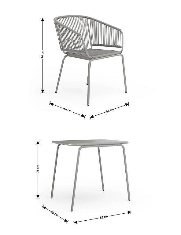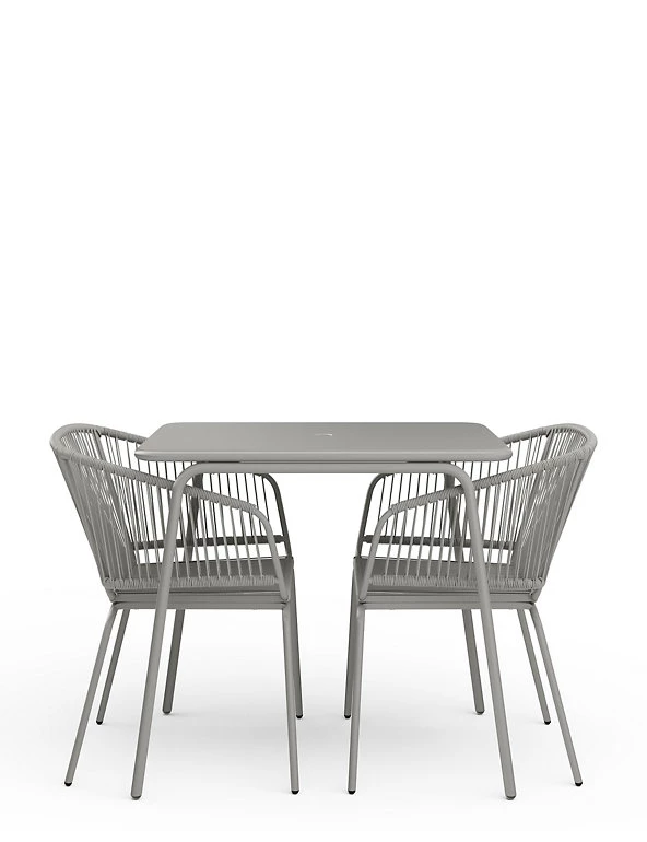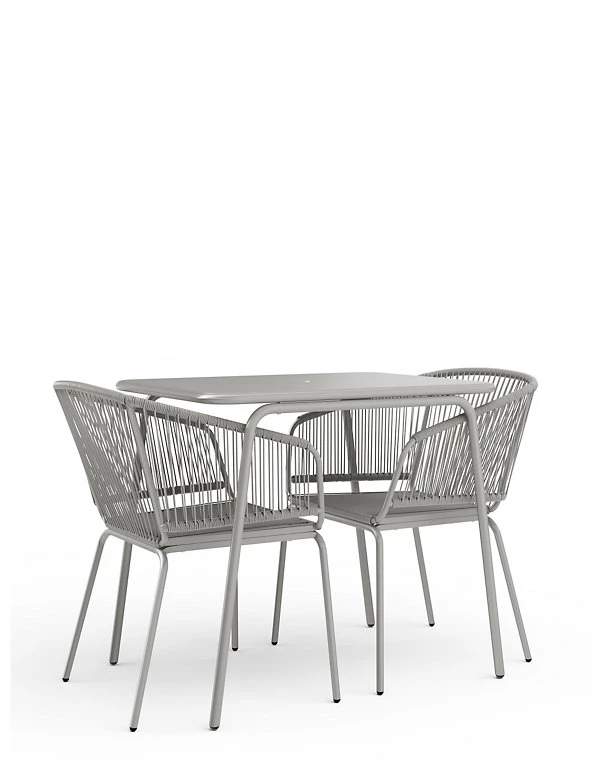 Bring a modern look to your outdoor space with this stylish Lois bistro set. It includes a square metal table and two curved woven chairs, all powder-coated for long-lasting wear.