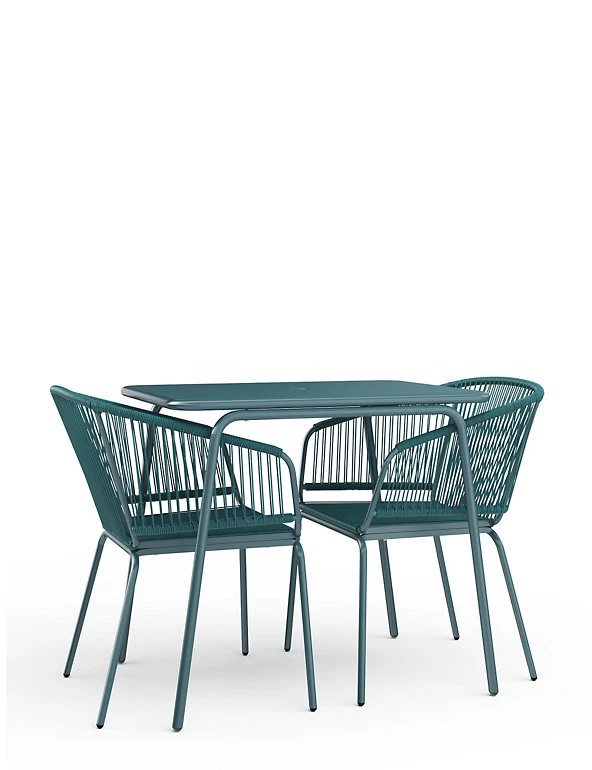 Enjoy an al fresco dinner with this bistro table set from the Lois collection. It includes two curved woven chairs and a matching table crafted from durable metal. The powder coating adds a protective layer for long-lasting wear.
