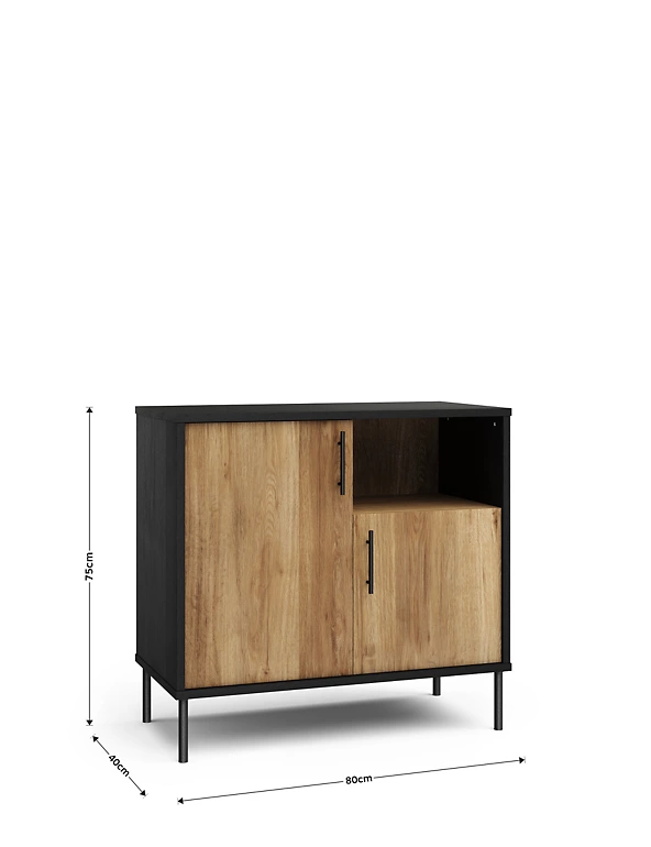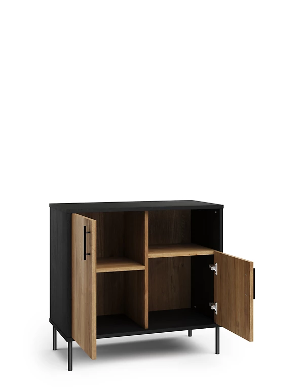 With a black oak-effect finish, this Holt sideboard combines contemporary industrial style with rustic charm. The four-compartment design is ideal for organising records, books and miscellaneous items. This piece features two doors at varying lengths, with black metal bar handles, and sits atop coordinating metal legs.