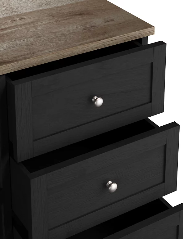 - light grey or statement black with a contrasting oak effect top or opt for an all over oak effect. All choices come with brushed nickel handles.